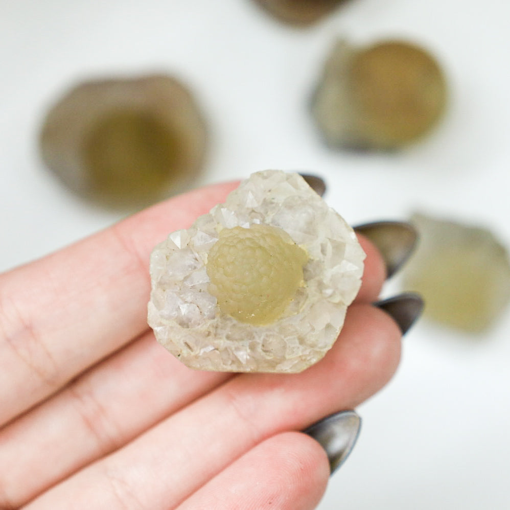 Gorgeous fluorite Ball (known as Botryoidal Fluorite) sitting on Quartz base